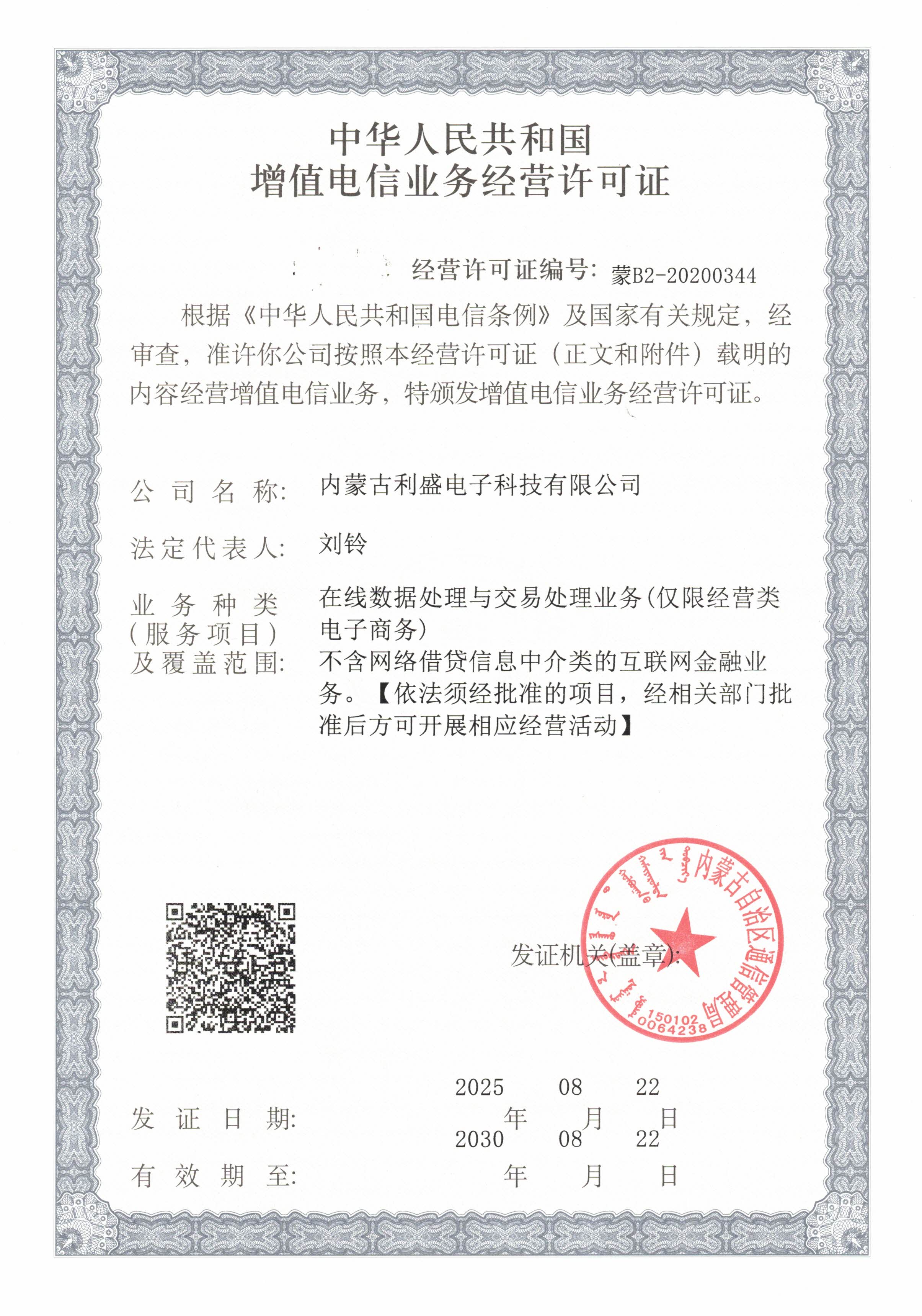 增值电信业务经营许可证 蒙B2-20200344