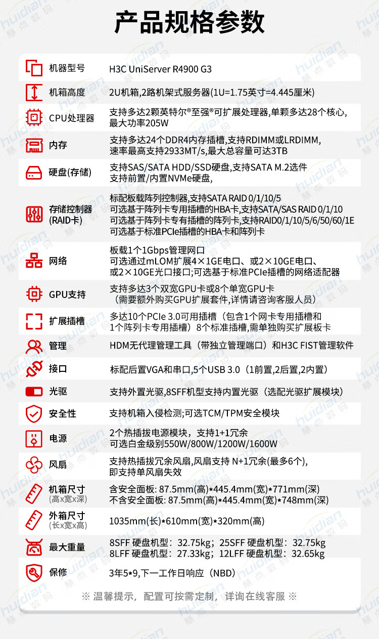 华三H3C R4900G3机架式服务器配置2颗CPU(2.4GHz 24核),512GB缓存,2块960GB SSD硬盘,配置DVD光驱,配置带2G缓存Raid卡,2个万兆光口,4个电口,2端口16GB HBA卡,1个T4显示加速卡,DVD光驱冗余电源,3个风扇,3年硬盘不返还维保服务