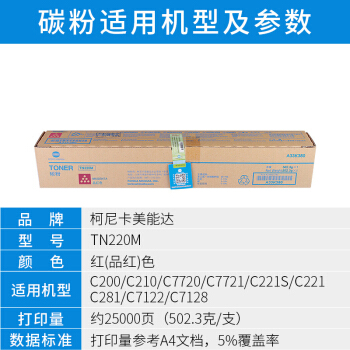 柯尼卡美能达(KONICA MINOLTA) TN220KCMY 黑蓝红黄碳粉C221/C281墨粉 TN220M品红 高容量 约25000页