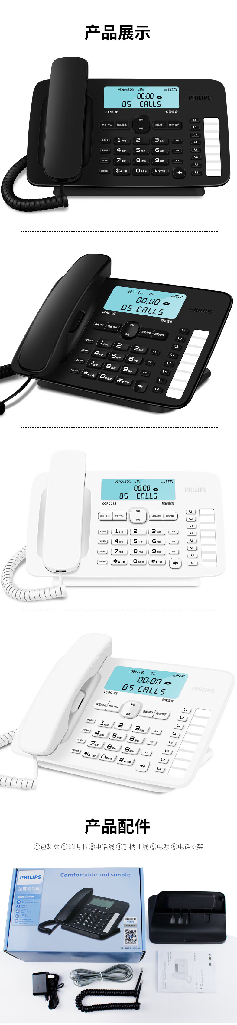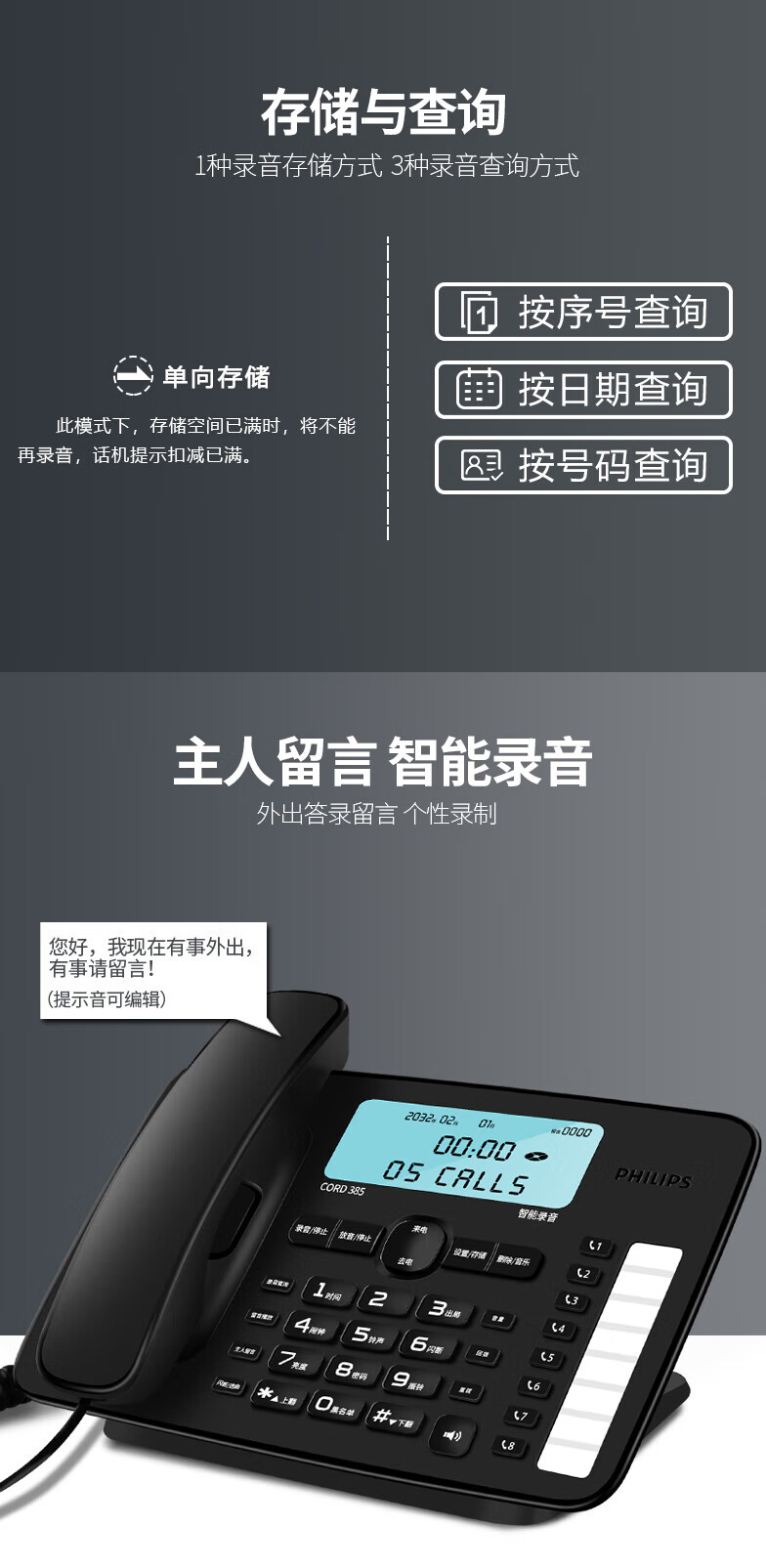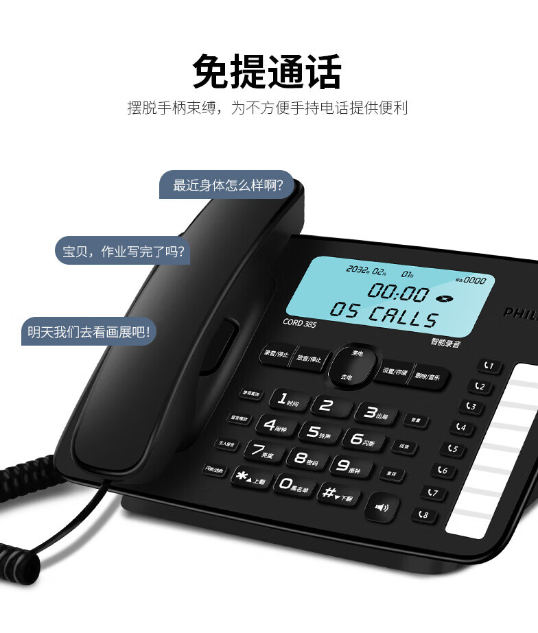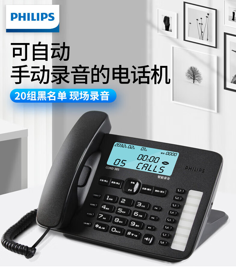 飞利浦/PHILIPS CORD385 普通电话机 录音电话机 固定座机 办公家用 自动手动录音