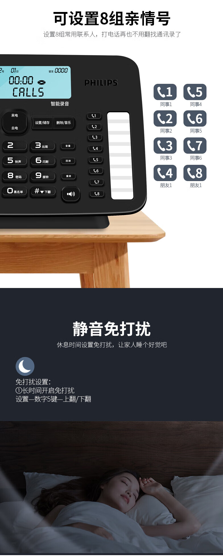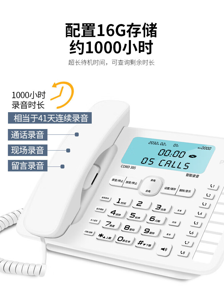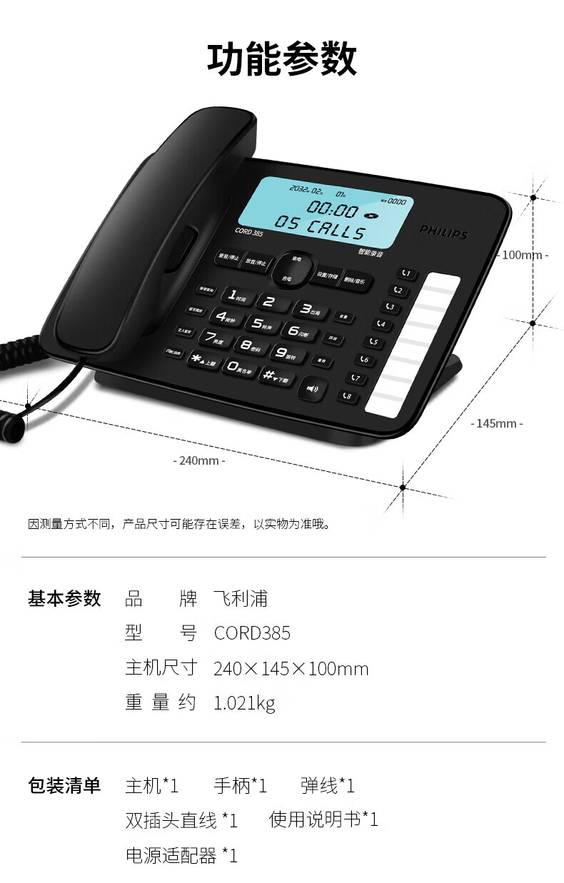 飞利浦/PHILIPS CORD385 普通电话机 录音电话机 固定座机 办公家用 自动手动录音