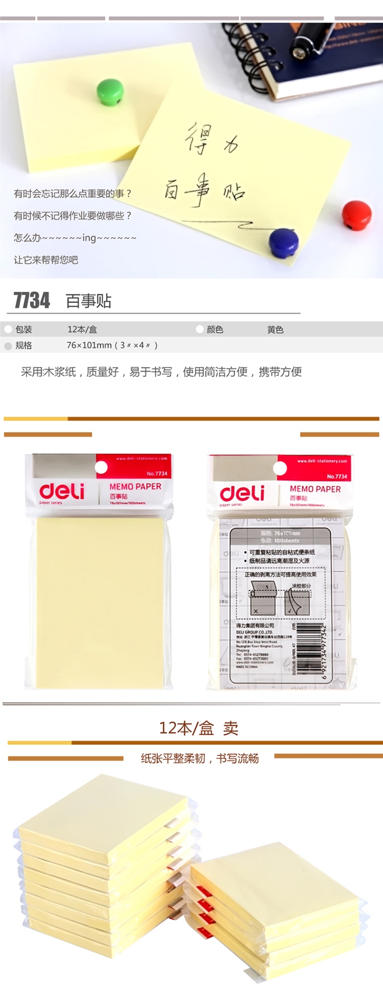 得力 deli 强黏性便利贴/标签纸/便签纸 可反复粘撕 7736 76mm*51mm 1包装