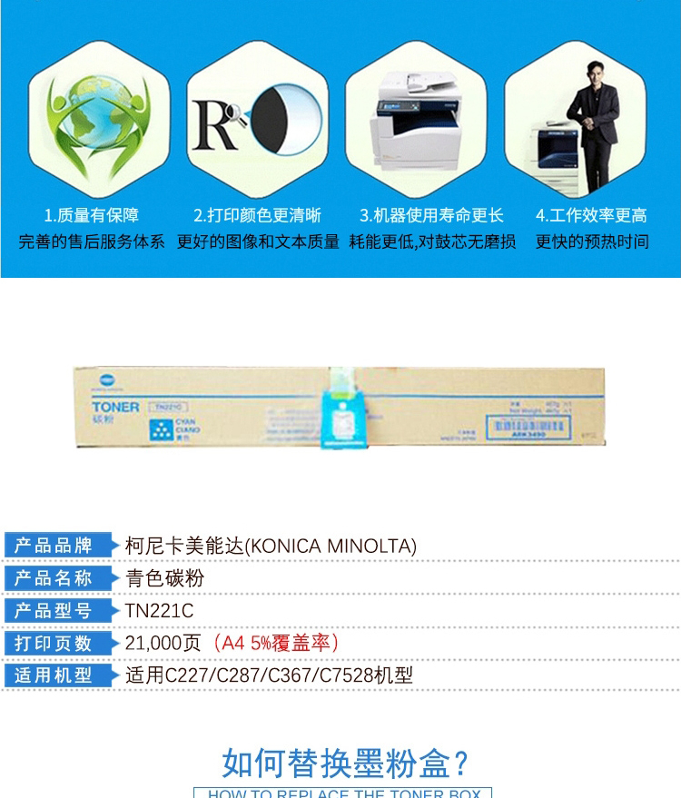 柯尼卡美能达/KONICAMINOLTA MINOLTA TN221C 柯美青色碳粉(适用C227/C287/C367/C7528机型)印量21000页