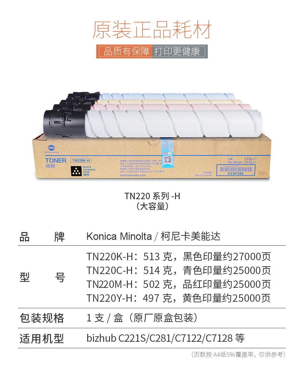 柯尼卡美能达(KONICA MINOLTA) TN220KCMY 黑蓝红黄碳粉C221/C281墨粉 TN220Y-L 黄色 约5000页