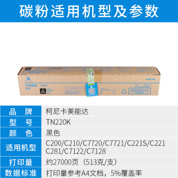 柯尼卡美能达(KONICA MINOLTA) TN220KCMY 黑蓝红黄碳粉C221/C281墨粉 TN220K黑色 高容量 约27000页