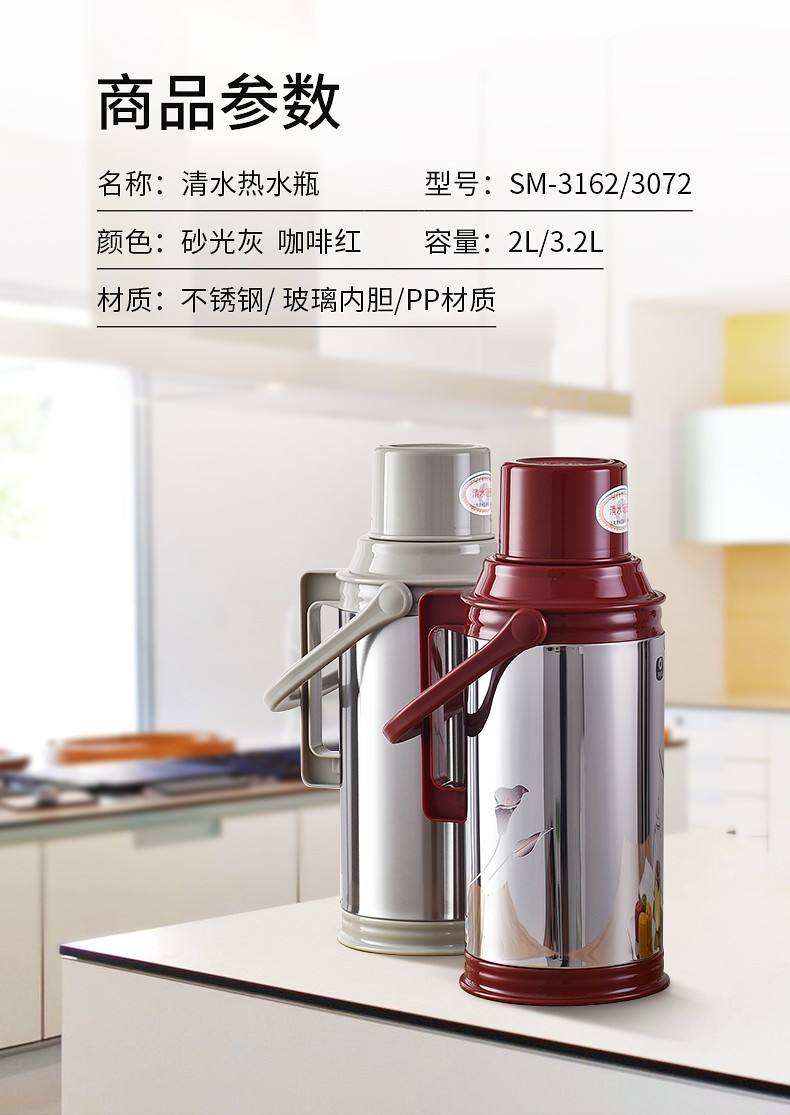 清水SM-3072 保温壶 不锈钢开水瓶 大容量暖瓶 玻璃保温容器及其玻璃胆 砂光3.2L