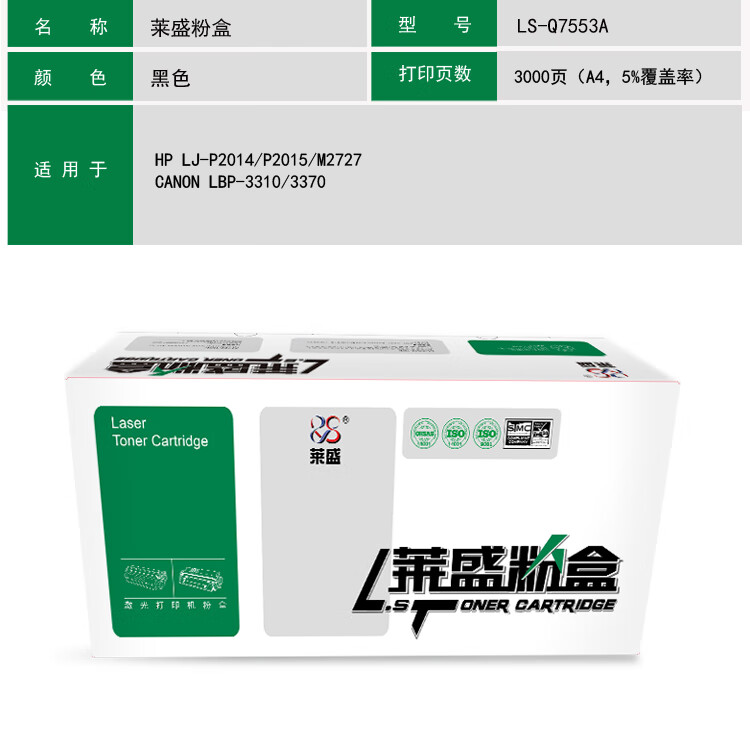 莱盛 LS-Q7553A 硒鼓 黑色 适用于HP LJ-P2014/P2015/M2727,CANON LBP-3310/3370