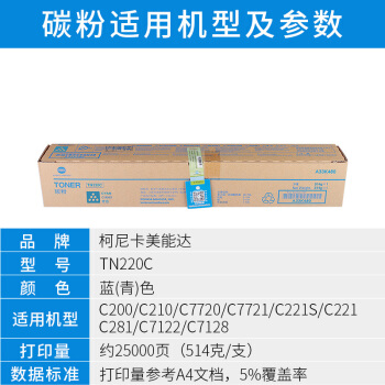 柯尼卡美能达(KONICA MINOLTA) TN220KCMY 黑蓝红黄碳粉C221/C281墨粉 TN220C蓝色 高容量 约25000页