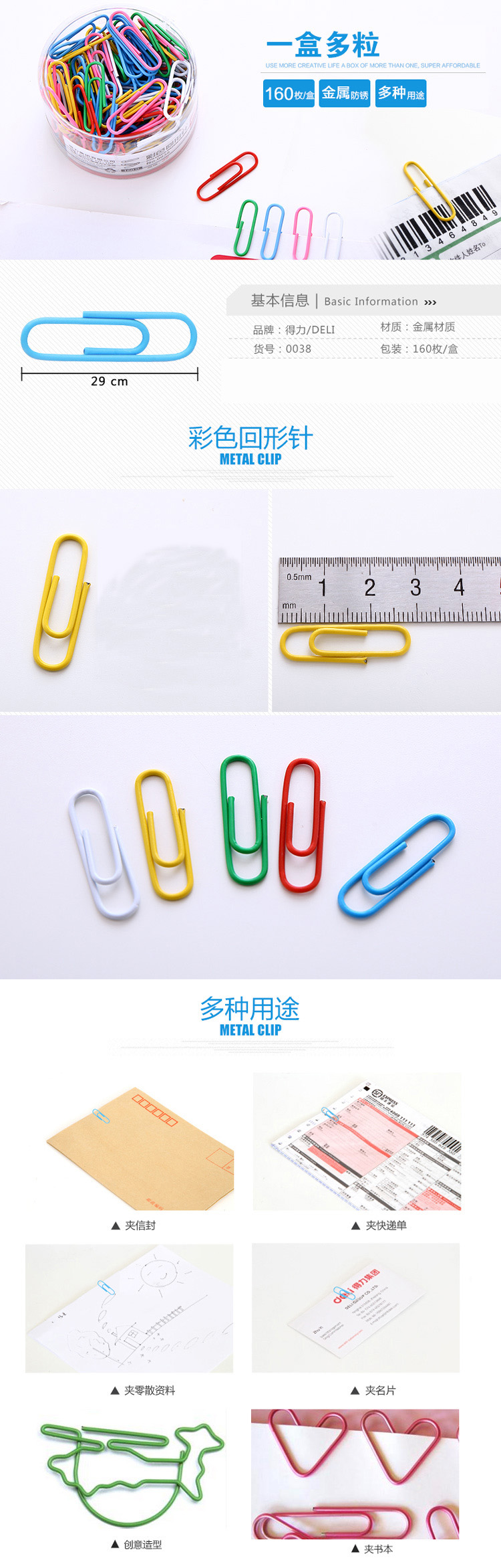 得力(deli) 0038 29mm 彩色回形针 易分类易标识160枚/筒