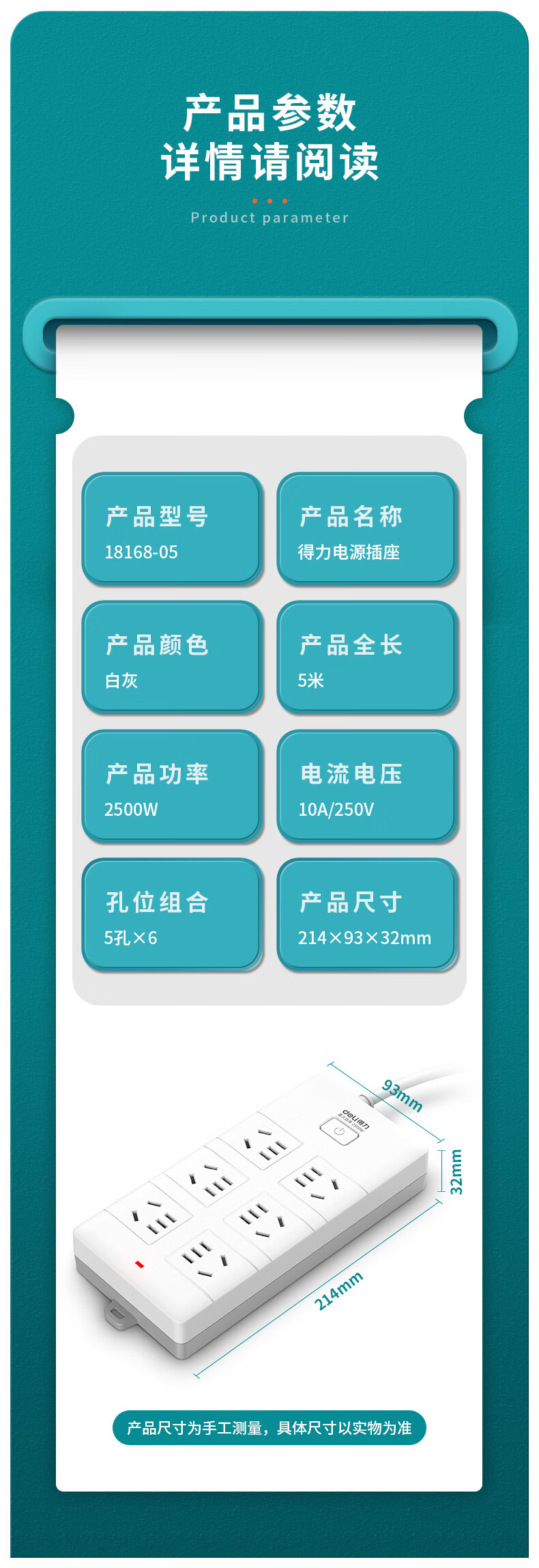 得力(deli)18168-05(5米)插座白灰色 5孔6组 2500W 10A 250V 加粗线芯 儿童保护门 750℃高温阻燃材质