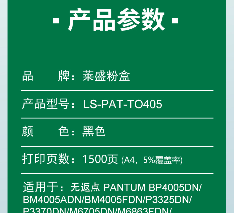 莱盛 LS-PAT-TO405 粉盒 适用于 PANTUM BP4005DN/BM4005ADN/BM4005FDN 12支/箱 全新粉仓 黑色 1.5K