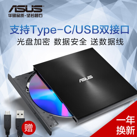 华硕 ASUS 8倍速 外置DVD刻录机 移动光驱 支持USB/Type-C接口 兼容苹果系统/SDRW-08U9M-U -黑色