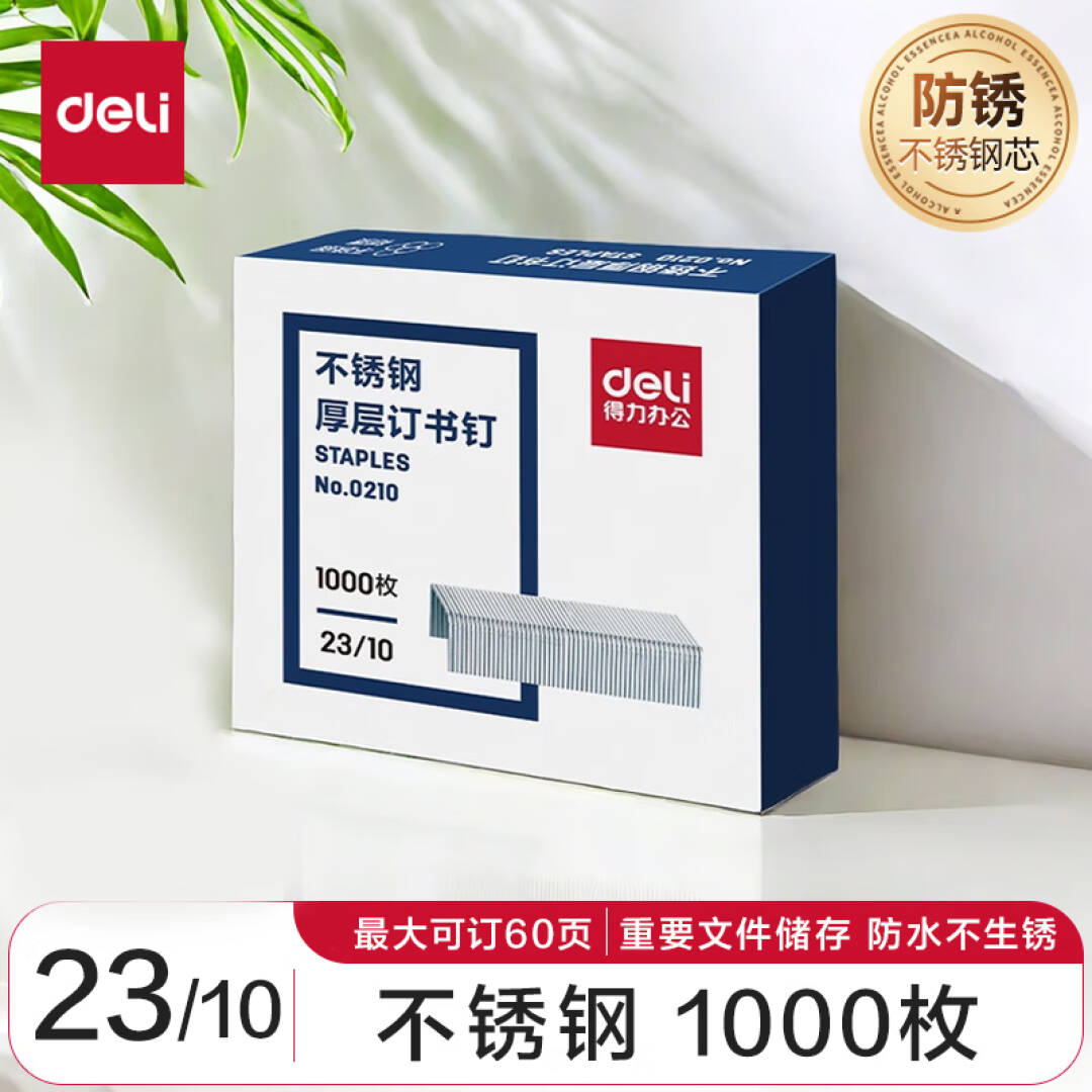 得力/deli 0210 装订及打孔类 23/10不锈钢厚层订书钉可订60页1000枚 单盒装