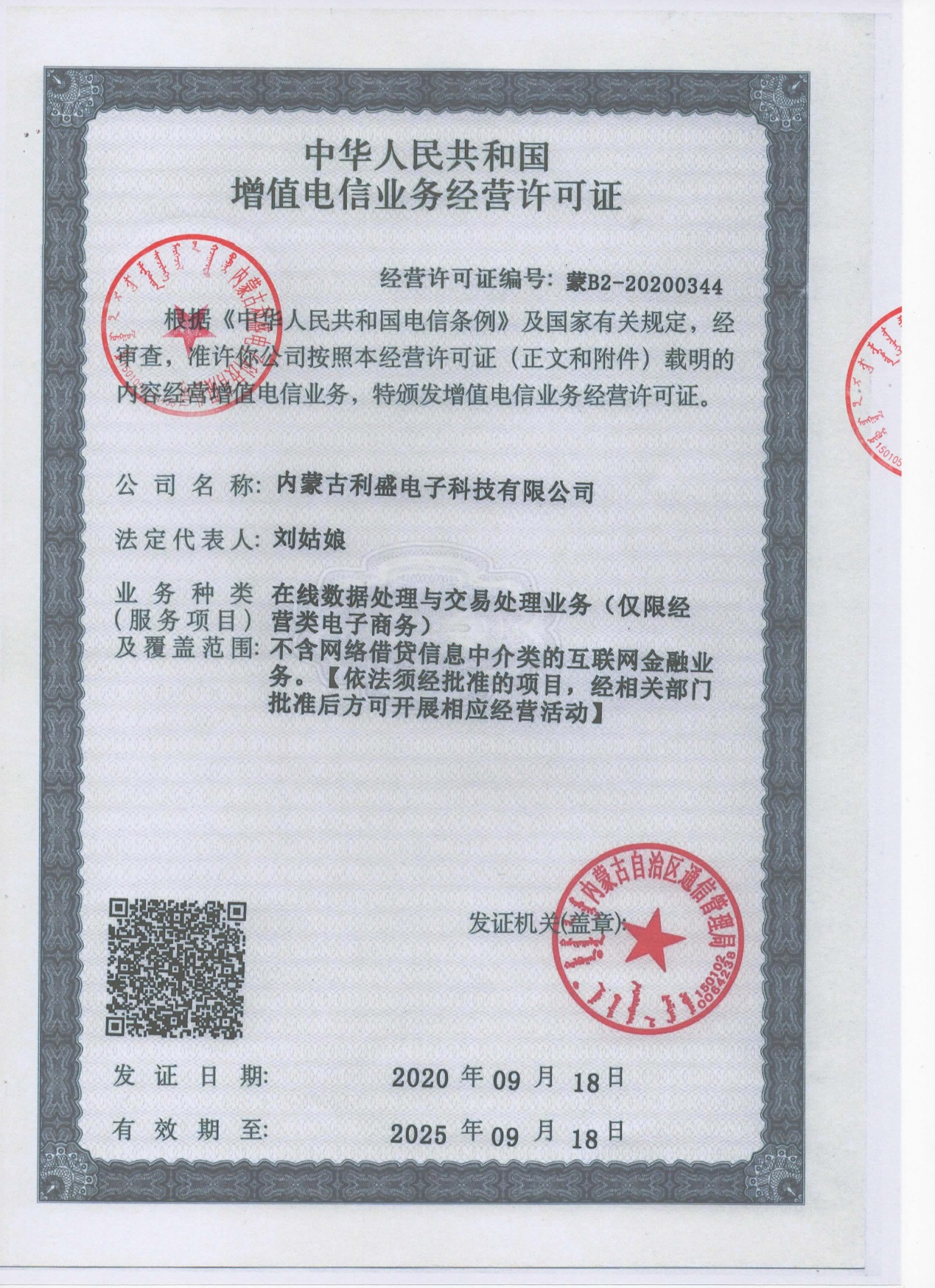 增值电信业务经营许可证 蒙B2-20200344